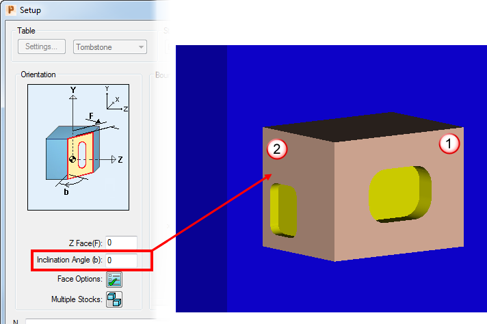 Stock Orientation in Multiple Stock Machining — Using the settings in this area of the dialog, you can specify different Face windows for different sides of the box and program them in the orientation needed to produce the NC code required to reflect how things will be set up on the table. Setting these options also enables PartMaker to connect the machining functions together to show the correct finished part when using PartMaker simulation.