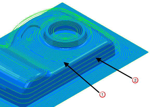 Shows the 3D Offset toolpath overlapping into the steep areas.
