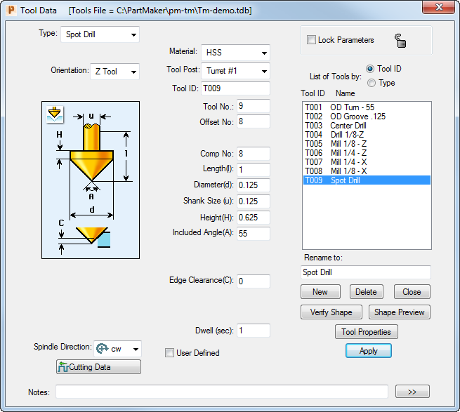 When a Spot Drill is selected, the Tool Data/Edit Tool dialog is the same as for the Chamfer tool, except that the Small Diameter field is not displayed for Spot Drill tools.