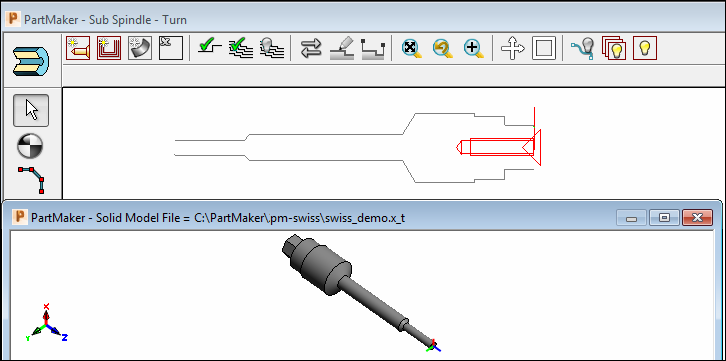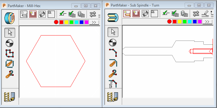 As you select a Face window from the Job Explorer pane, PartMaker opens that Face window in its own window. Each window has a title bar and you can size and position each window independently. For example: