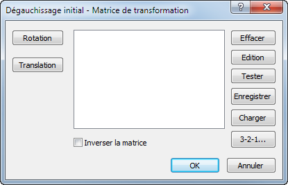 Par exemple, la boîte de dialogue CAO - Matrice de transformation affiche un bouton Symétrie et Echelle. La boîte de dialogue Dégauchissage initial - Matrice de transformation affiche un bouton 3-2-1.