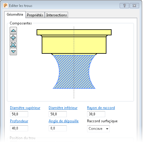 L'onglet Géométrie sur le dialogue Editer trou édite un composant de trou.
