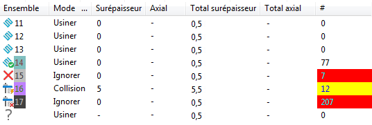 Le nombre de surfaces d'attaches qui évitent les collisions ou sont ignorées pour chaque parcours d'outil est affiché dans les lignes appropriées de la boîte de dialogue Surépaisseur du composant.