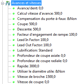Pour voir les effets de vos changements, sélectionner un des parcours d'outils, sélectionner un des parcours d'outils, et étendre l'entité Avances et vitesses dans la fenêtre d'explorateur.