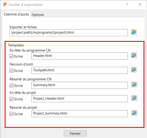 - Conservez le jeu de templates par défaut, et utilisez la case à cocher Ecrire pour indiquer les templates à utiliser pour créer des feuilles d'organisation. Par exemple, si vous n'avez besoin que d'une page d'en-tête spécifique au projet et des feuilles de résumé de programme CN, désélectionnez les cases à cocher Ecrire pour Header.html, Toolpath.html et Project_Summary.html.