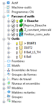Lors de la création d'entités telles que des parcours d'outils, vous devez sélectionner d'autres entités telles que l'outil, le plan de travail, la frontière/le motif et, si le parcours d'outil doit être post-traité, le programme CN. Si ces autres entités sont actives, alors elles sont automatiquement sélectionnées.