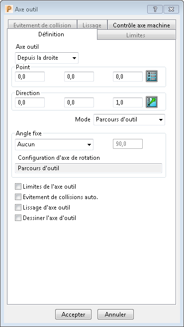 Le dialogue Axe d'outil contient les onglets suivants: