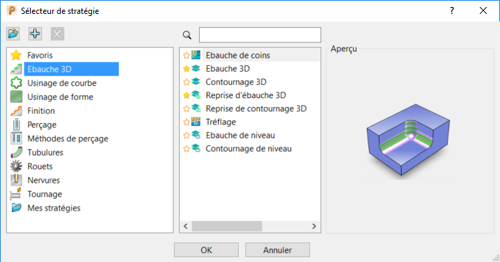 Le dialogue Sélecteur de stratégie affiche la gamme de stratégies que vous pouvez sélectionner afin de créer les parcours d'outils. Quand vous sélectionnez une stratégie, PowerMill affiche le dialogue Stratégie, qui vous permet de spécifier les paramètres et besoins du parcours d'outil.