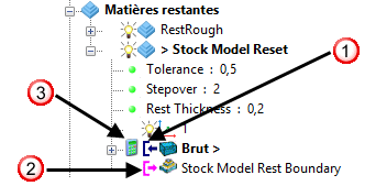 Lorsqu'une entité est appliquée à un modèle de brut, elle produit un Etat matière restante. Cela représente l'état de la matière du brut en un point précis du processus d'usinage, lequel est défini par les opérations des entités actuellement appliquées dans le modèle de brut.