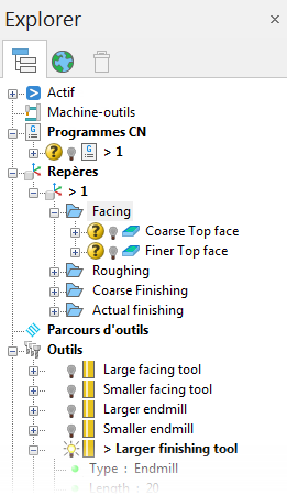 L'explorateur affiche les entités PowerMill utilisé dans un PowerMill. (le terme Entité largement fait référence à toutes les entrées dans l'explorateur. Les entités dans l'Explorateur sont regroupées par type, par exemple, les trajectoires d'outil sont regroupées dans la branche et trajectoires d'outils sont regroupés dans la branche Outils. Parce qu'un projet de PowerMill contient souvent beaucoup d'entités, l'Explorateur utilise un système actif