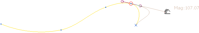- Sélectionner un point sur la courbe pour l'éditer. La courbe est en jaune, a une poignée rouge au point sélectionné et deux lignes rouge mat avec des cercles sur leur extrémité, indiquant la direction de tangence et l'amplitude.
