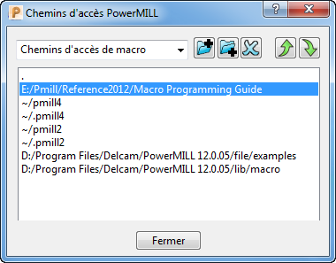 Sélectionnez le chemin d'accès de macro à déplacer (dans ce cas E:/Pmill/Reference2012/Macros) puis sélectionnez le bouton Descendre