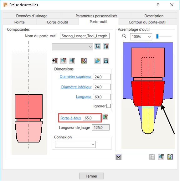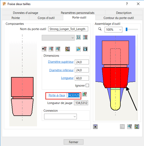 Porte-à-faux — Cliquer pour calculer automatiquement la valeur de porte-à-faux minimum basée sur le contour de porte-outil.