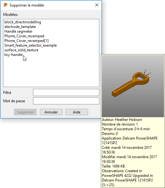 pour déplacer la mise en évidence et pour faire défiler la liste. L'info-bulle graphique affiche une miniature du modèle et les informations du fichier.