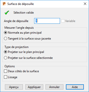 Quand cette option est sélectionnée, le bouton Aperçu est indisponible. Quand vous cliquez sur Appliquer, la boite de dialogue Dépouille variable est affichée. Utilisez cette boite de dialogue pour entrer les angles de dépouille variables.
