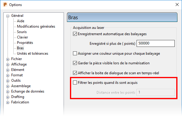Utilisez l'option Filtrer les points quand ils sont acquis de la page Bras de la boite de dialogue d'options, pour filtrer les points pendant le scan.