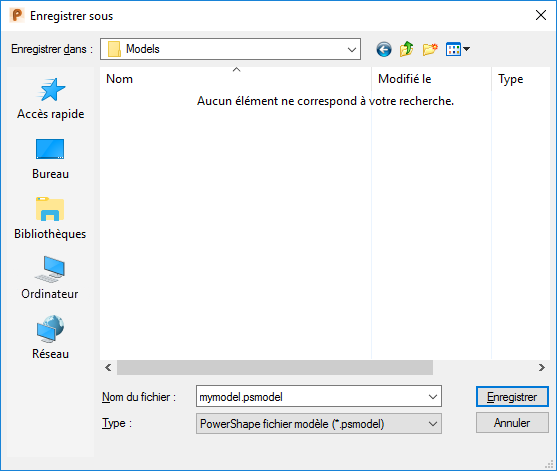 Si le nom est déjà utilisé, un message d'avertissement s'affiche. Si vous continuez, le modèle existant est remplacé.