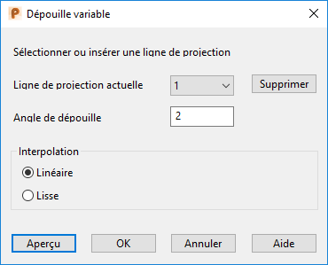 Interpolation — Vous pouvez faire varier les angles de dépouille soit linéaire, soit lisse entre les lignes de projection.