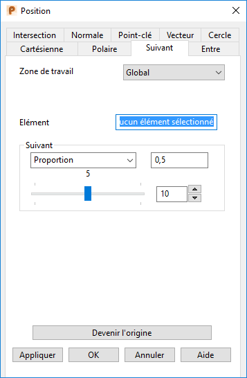 Appliquer — Entre la position. Si l'opération actuelle permet plusieurs points, la boite de dialogue reste affichée, prête pour que vous puissiez entrer plus de points. Autrement, la boite de dialogue est fermée.