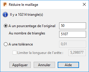 - Cliquez sur Outils de maillage > Triangles > Réduire pour afficher la boite de dialogue Réduire le maillage :