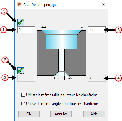 Utilisez cette boite de dialogue pour spécifier l'angle et la taille du chanfrein pour un trou.