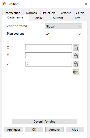 Utilisez l'onglet Cartésienne de la boite de dialogue Position pour entrer des positions dans les différentes cases fournies pour chaque axe. Vous pouvez les voir individuellement en cliquant sur