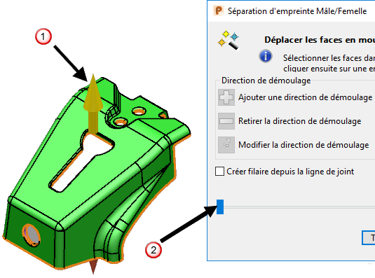 (barre d'outils Sélectionner une direction de démoulage) pour accepter la direction de démoulage par défaut et affecter la pièce sélectionnée à la nouvelle direction de démoulage.