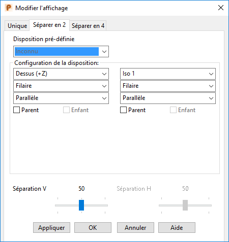Quand vous sélectionnez un onglet, la boite de dialogue affiche les options disponibles pour chaque vue. Par exemple, quand vous sélectionnez l'onglet Séparer en 2, la boite de dialogue affiche les options pour les deux vues :