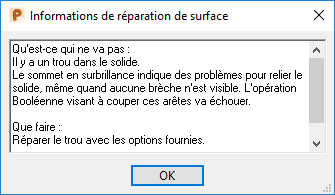 — Cliquez pour afficher la boite de dialogue Informations de réparation de surface, qui affiche les détails des opérations de la réparation suggérée :