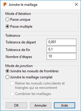 - Joindre le maillage complet applique l'opération de jointure sur la totalité du maillage. Sélectionnez Retirer les noeuds coïncidents et les triangles effondrés ou Combiner les maillages pour spécifier la méthode de jointure.