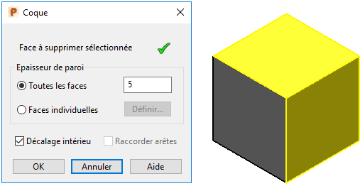 - Utilisez la boite de dialogue pour retirer une face d'un solide et la décaler pour créer une coque de solide.