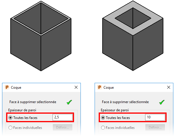 - Faces individuelles — Spécifiez une valeur d'épaisseur de paroi différente pour chaque face, en utilisant la boite de dialogue Epaisseur de paroi individuelle.