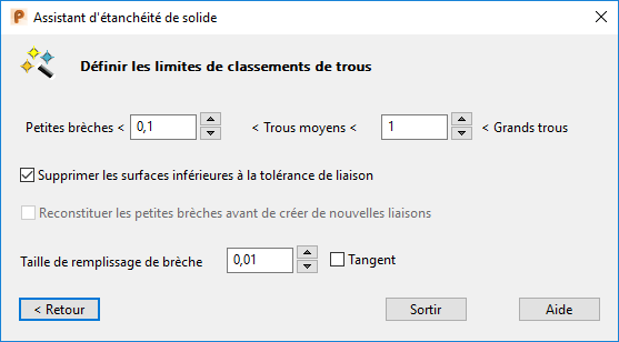 Supprimer les surfaces inférieures à la tolérance de liaison — Désélectionnez cette option pour limiter la tolérance de liaison maximale à la taille la plus petite. Sélectionnez cette option pour limiter la tolérance de liaison maximale à la taille de brèche la plus grande.