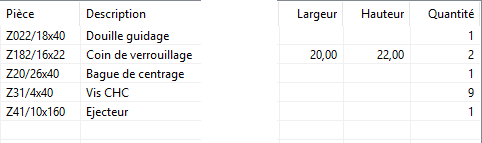La boite de dialogue Nomenclature prend en charge les structures hiérarchiques tels que les sous-assemblages. Les entrées peuvent être :
