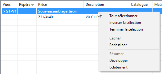 Cliquez avec le bouton droit sur l'entrée du sous-assemblage dans le tableau pour afficher le menu contextuel :