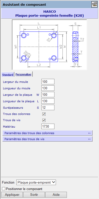 Utilisez les options comme Largeur de plaque, Longueur de plaque et Epaisseur pour changer les dimensions. Les paramètres exacts qui sont affichés dans l'onglet Personnaliser reflètent le type de composant que vous définissez.