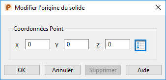 - Origine du solide — Sélectionnez cette option pour afficher la boite de dialogue Modifier l'origine du solide :