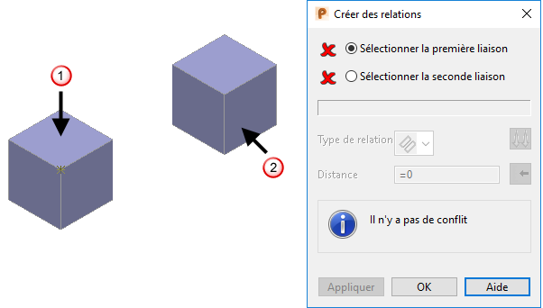 Utilisez la boite de dialogue Créer des relations pour créer des relations entre des composants en sélectionnant des liaisons. Dans cet exemple, une relation est créée entre les deux composants de bloc solide :