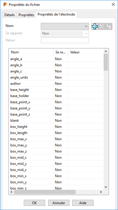 Se rappeler — Sélectionnez OuiouNon dans la liste déroulante. Si vous sélectionnez Oui, la valeur pour cette propriété est automatiquement entrée dans la boite de dialogue Détails d'électrode supplémentaires.