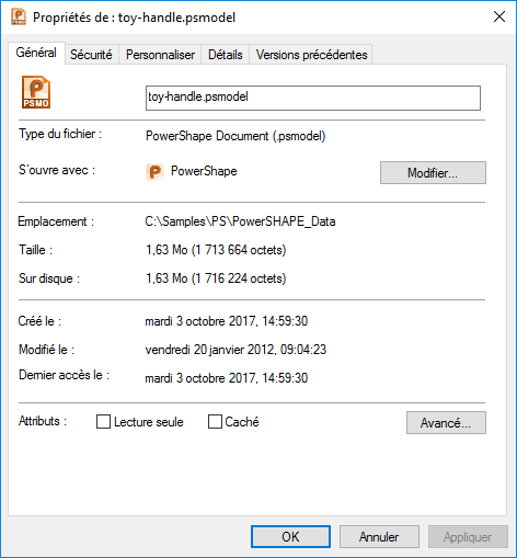 Quand vous ouvrez un psmodel, les informations suivantes sont lisibles depuis la boite de dialogue Fichier > Propriétés de l'explorateur de Windows et sont stockées par PowerShape :