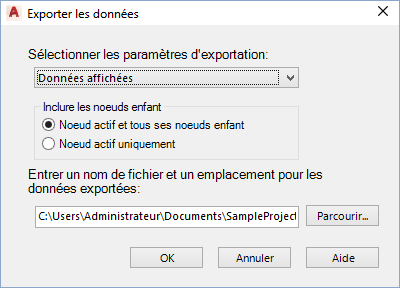 L'exportation inclut le noeud sélectionné et tous ses noeuds enfant.