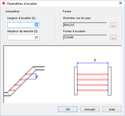 Définit les paramètres de géométrie de l'escalier. Les valeurs numériques indiquées entre parenthèses correspondent à la géométrie étiquetée dans l'image d'aperçu.