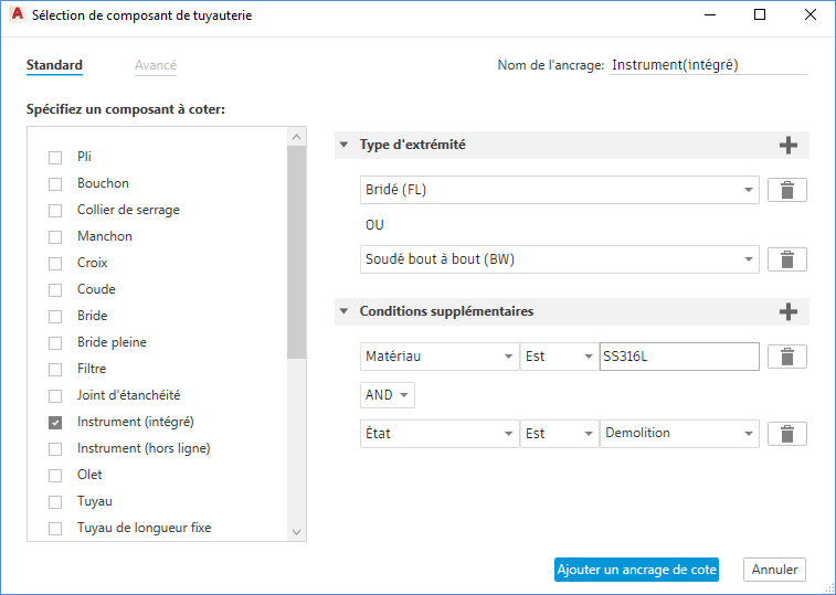 Configure les composants de tuyauterie lors de l’ajout d’un ancrage à une cote ou d’une exclusion.
