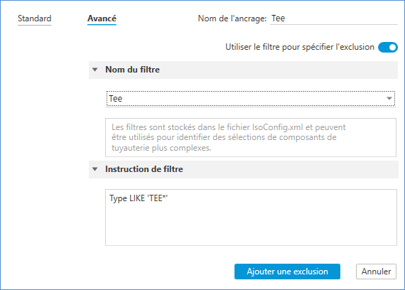 Permet de filtrer des ancrages spécifiques de manière à sélectionner un filtre existant comme ancrage ou exclusion de cote. Les filtres sont stockés dans le fichier IsoConfig.xml et peuvent être utilisés pour identifier des sélections de composants de tuyauterie plus complexes.