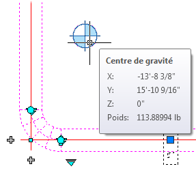 Lorsque le centre de gravité actif est activé et que vous sélectionnez des tuyauteries, supports de tuyauterie ou équipements, un glyphe de centre de gravité s'affiche dans la zone de dessin.
