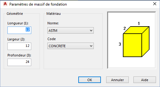 Indique la norme de matériau et le code de matériau par défaut des massifs de fondation.