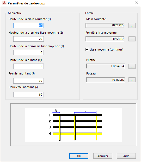 Modifie les paramètres de géométrie du garde-corps sélectionné. Les valeurs numériques indiquées entre parenthèses correspondent à la géométrie étiquetée dans l'image d'aperçu.