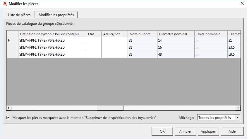 Vous pouvez également définir ces valeurs dans le catalogue et créer ou mettre à jour la spécification des tuyauteries.