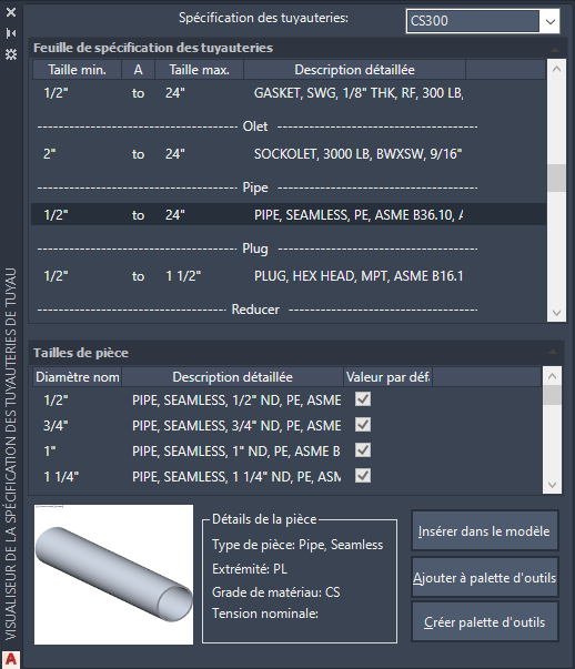 Affiche la spécification des tuyauteries courante dans AutoCAD Plant 3D toolset et permet d'ouvrir et d'afficher une feuille de spécification des tuyauteries, d'insérer des pièces de cette feuille dans un modèle, ainsi que de modifier les palettes d'outils.