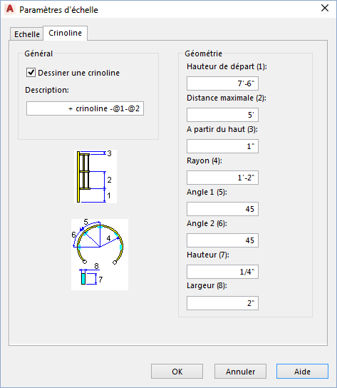 Modifie les paramètres de géométrie de la crinoline. Les valeurs numériques indiquées entre parenthèses correspondent à la géométrie identifiée dans l'image d'aperçu.